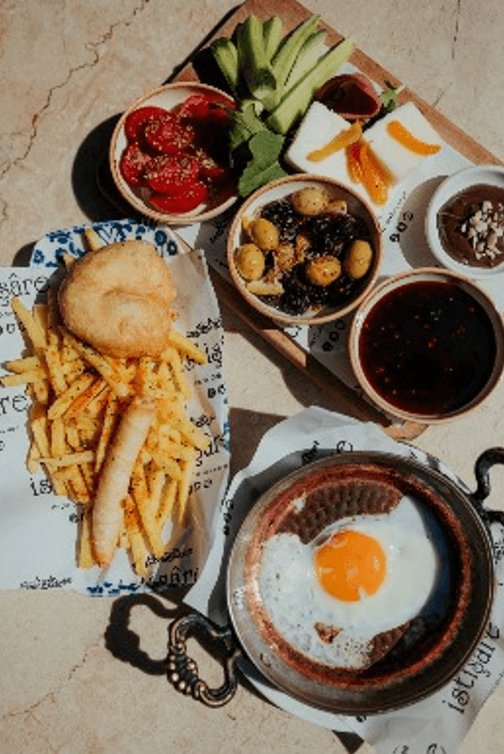 (Ezine peyniri, çeçil peyniri, çilek reçeli, domates ve salatalık söğüş, siyah ve yeşil zeytin, haşl...