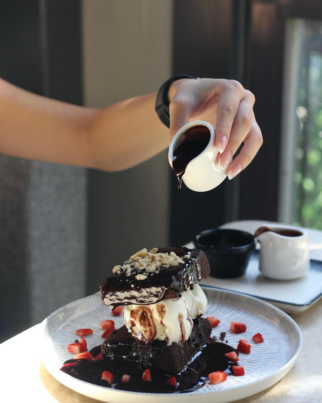 (Beğendi sos eşliğinde tavuk but parçaları, demi glace sos, kızarmış patates ile.)