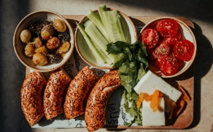 (Ezine peyniri, domates ve salatalık söğüş, siyah ve yeşil zeytin, bir adet simit.)